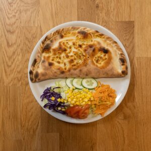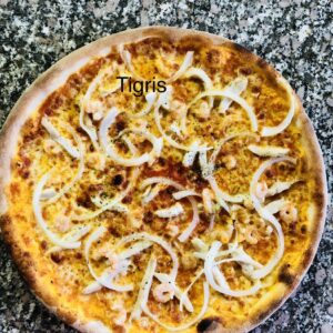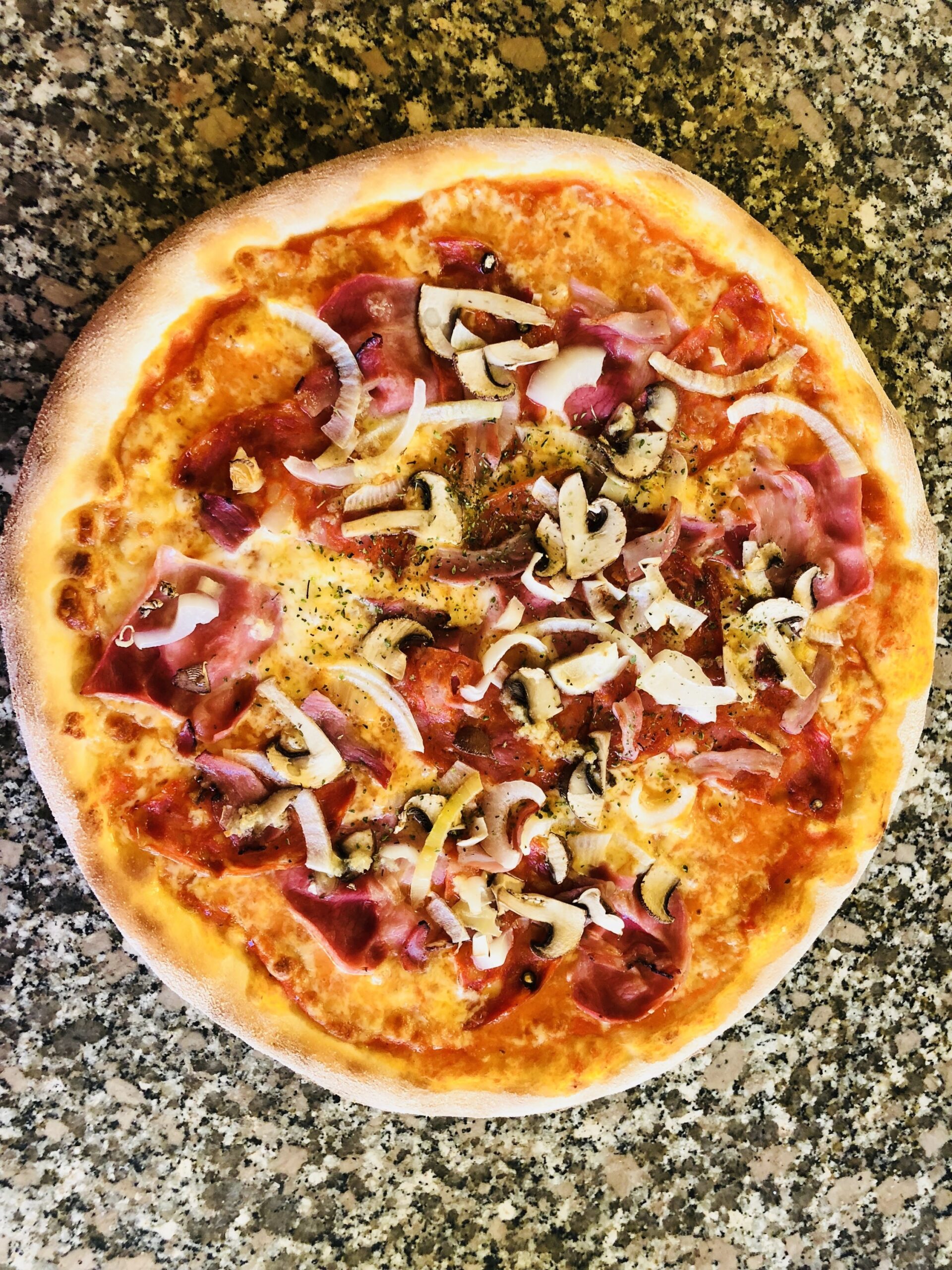 Tomatensauce, Mozzarella, Schinken, Salami, Speck, Champignons, Zwiebeln, Knoblauch, Rohschinken