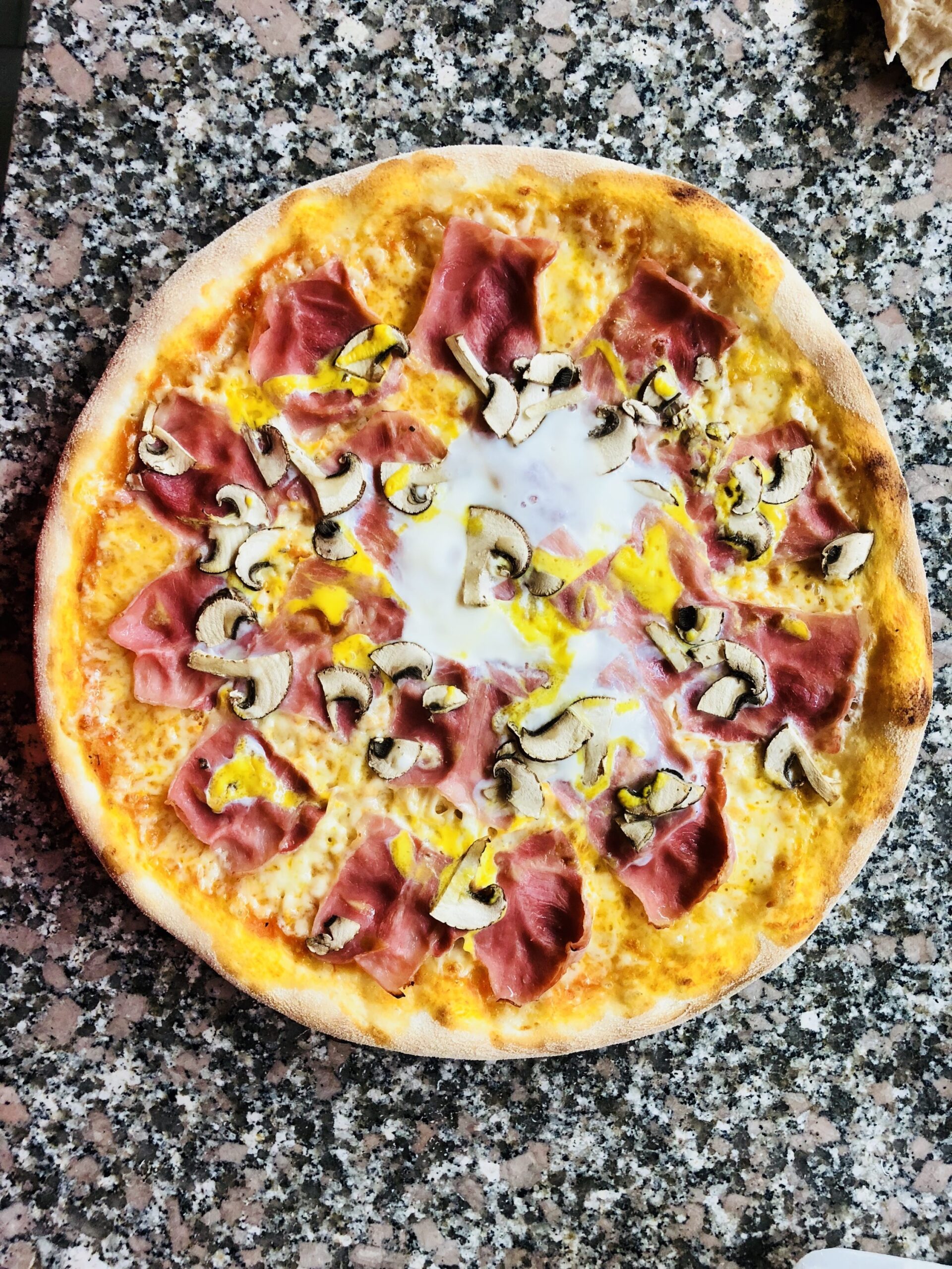 Tomatensauce, Mozzarella, Schinken, Champignons, Ei, Mais