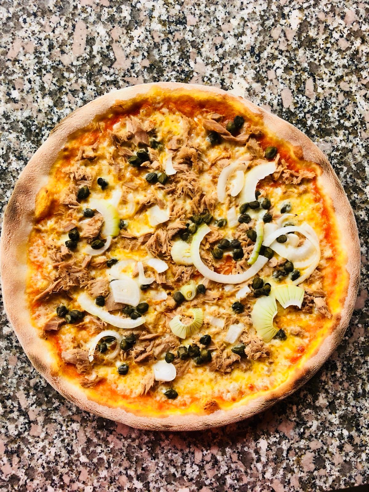 Tomatensauce, Mozzarella, Thon, Zwiebeln, Oliven