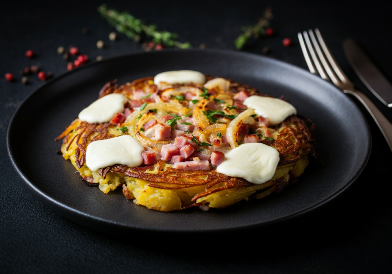 Schinken, Speck, Zwiebeln, überachten mit Mozzarella